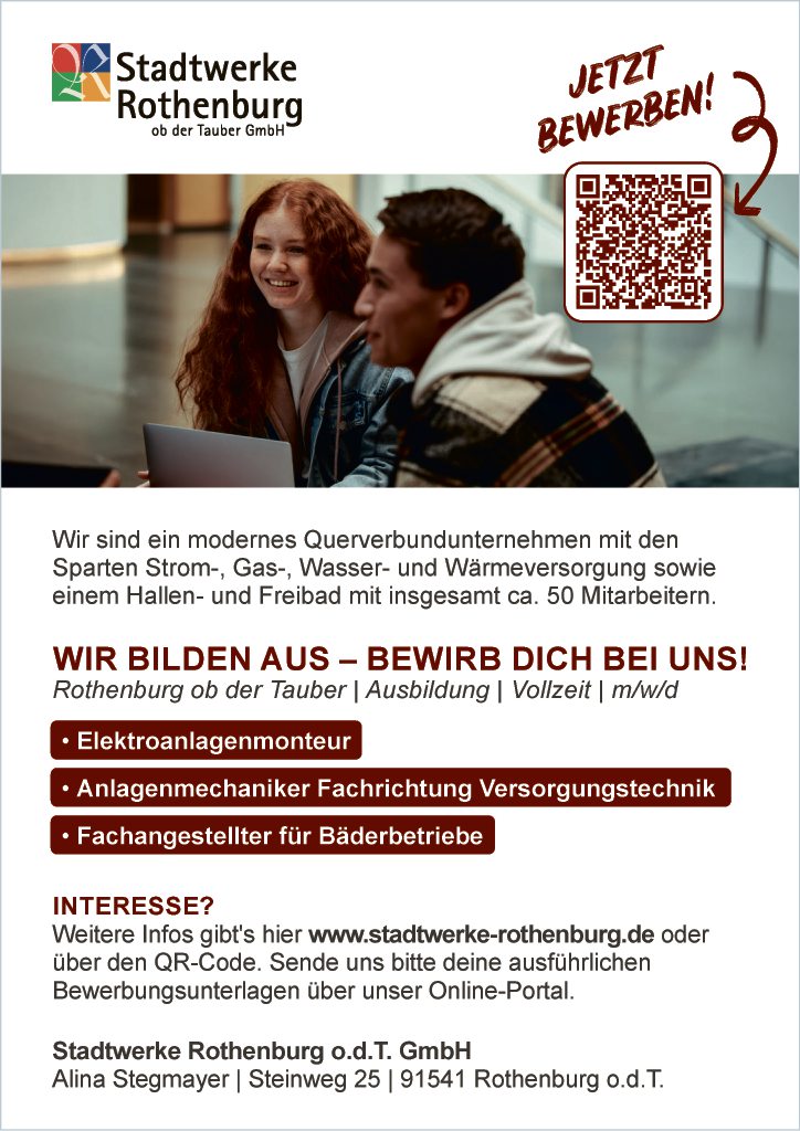 Weitere Infos gibt´s hier www.stadtwerke-rothenburg.de oder über den QR-Code. Sende uns bitte deine ausführlichen Bewerbungsunterlagen über unser Online-Portal.