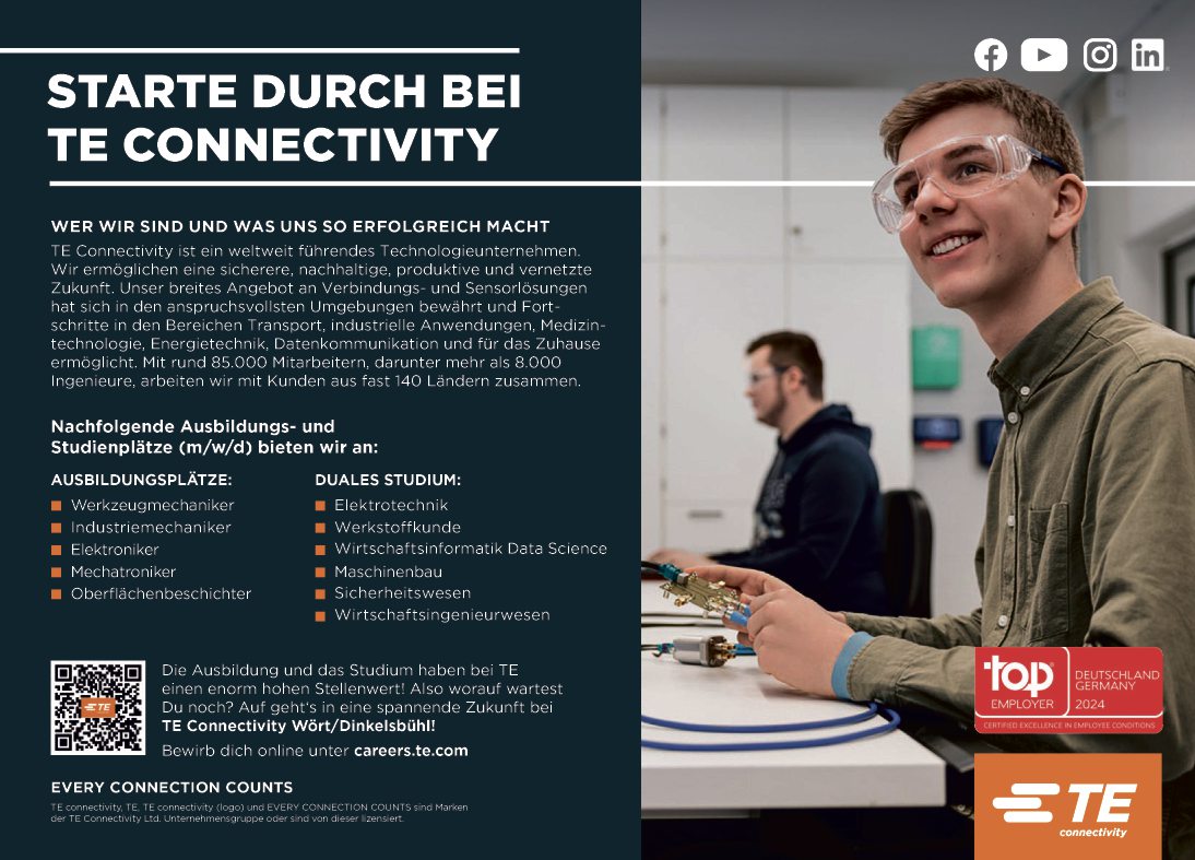 Die Ausbildung und das Studium haben bei TE einen enorm hohen Stellenwert! Also worauf wartest Du noch? Auf geht‘s in eine spannende Zukunft bei TE Connectivity Wört/Dinkelsbühl!