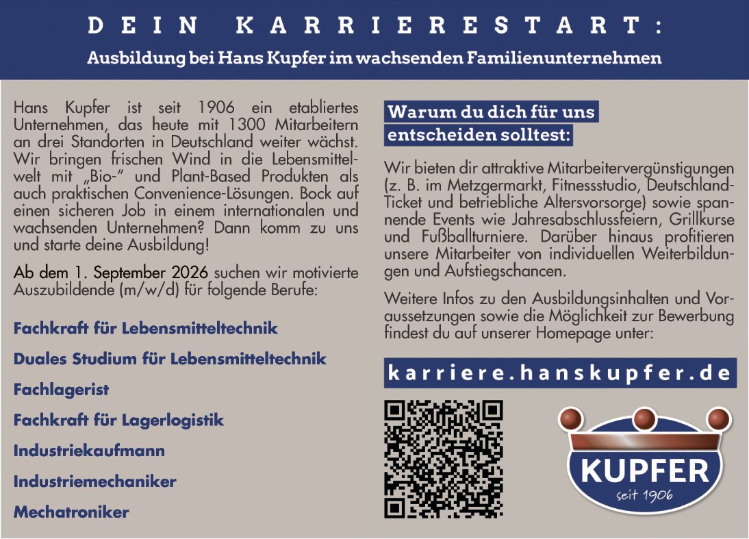Hans Kupfer ist seit 1906 ein etabliertes Unternehmen, das heute mit 1300 Mitarbeitern an drei Standorten in Deutschland weiter wächst. Wir bringen frischen Wind in die Lebensmittelwelt mit „Bio-“ und Plant-Based Produkten als auch praktischen Convenience-Lösungen. Bock auf einen sicheren Job in einem internationalen und wachsenden Unternehmen? Dann komm zu uns und starte deine Ausbildung!