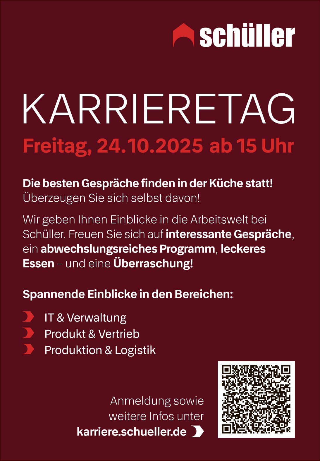 Wir geben Ihnen Einblicke in die Arbeitswelt bei Schüller. Freuen Sie sich auf interessante Gespräche, ein abwechslungsreiches Programm, leckeres Essen – und eine Überraschung!