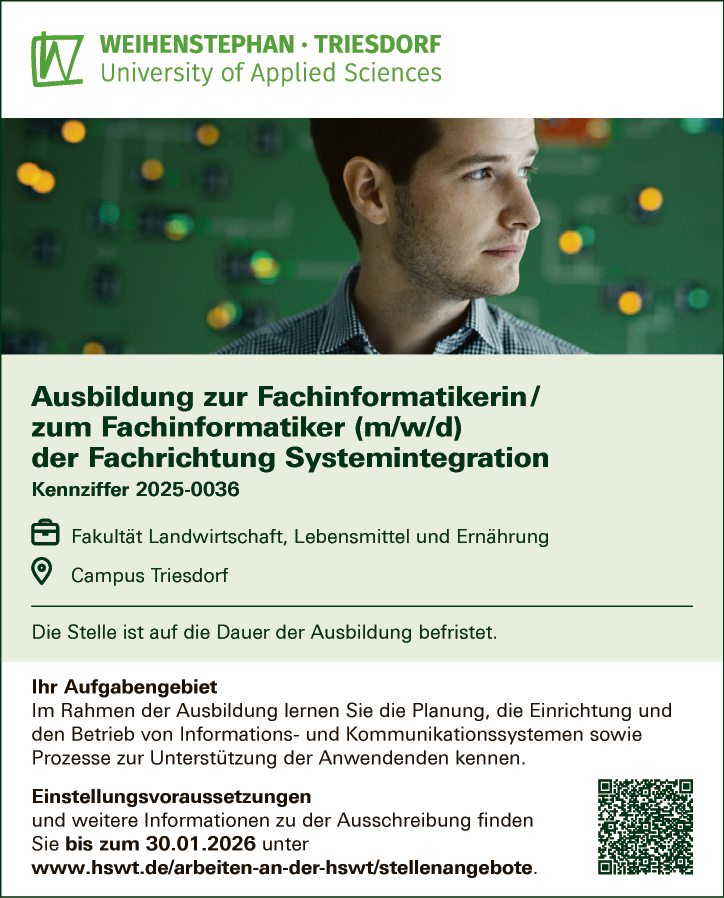 und weitere Informationen zu der Ausschreibung finden Sie bis zum 30.01.2026 unter www.hswt.de/arbeiten-an-der-hswt/stellenangebote.