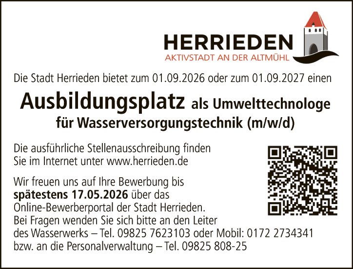 Wir freuen uns auf Ihre Bewerbung bis spätestens 17.05.2026 über das Online-Bewerberportal der Stadt Herrieden.