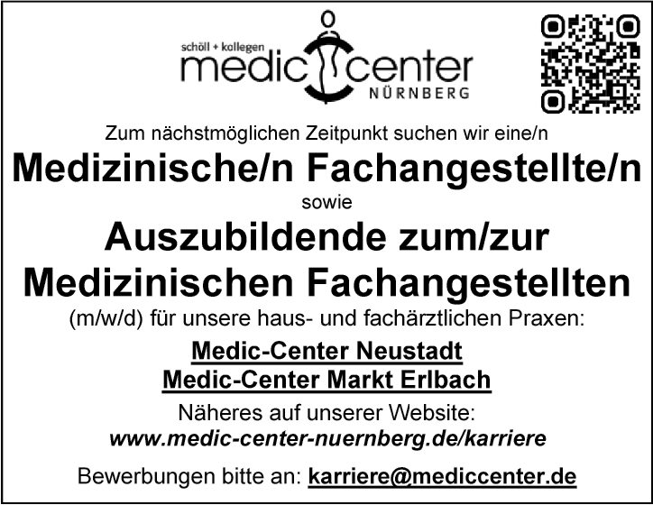 Näheres auf unserer Website: www.medic-center-nuernberg.de/karriere