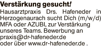 Bewerbung an praxis@dr-hafeneder.de oder über www.dr-hafeneder.de .