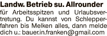 Landw. Betrieb su. Allrounder fĂźr Arbeitsspitzen und Urlaubsvertretung.