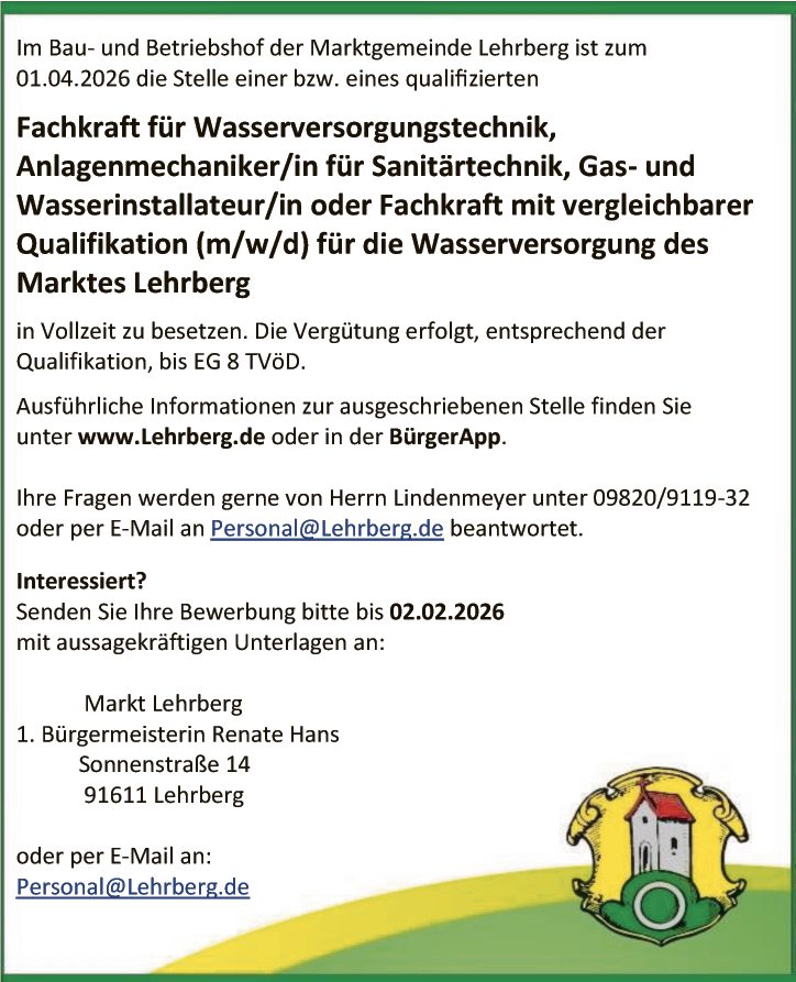 Im Bau- und Betriebshof der Marktgemeinde Lehrberg ist zum 01.04.2026 die Stelle einer bzw. eines qualifizierten Anlagenmechaniker/in für Sanitärtechnik, Gas- und Wasserinstallateur/in oder Fachkraft mit vergleichbarer Qualifikation (m/w/d) für die Wasserversorgung des Marktes Lehrberg in Vollzeit zu besetzen. Die Vergütung erfolgt, entsprechend der Qualifikation, bis EG 8 TVöD.