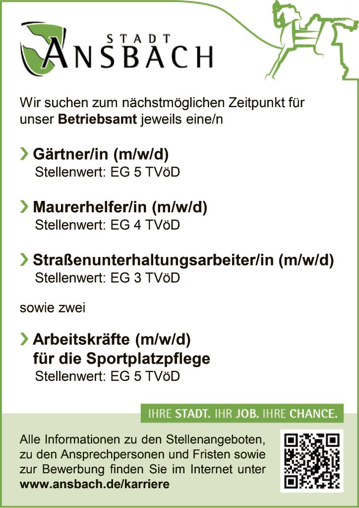 Alle Informationen zu den Stellenangeboten, zu den Ansprechpersonen und Fristen sowie zur Bewerbung finden Sie im Internet unter www.ansbach.de/karriere