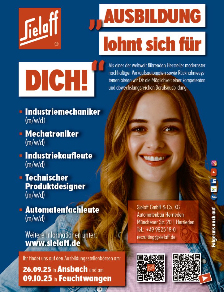 Ihr findet uns auf den Ausbildungsstellenbörsen am:26.09.25 in Ansbach und am 09.10.25 in Feuchtwangen