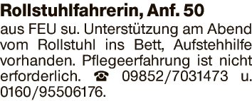Rollstuhlfahrerin, Anf. 50 aus FEU su. Unterstützung am Abend vom Rollstuhl ins Bett, Aufstehhilfe vorhanden. Pflegeerfahrung ist nicht erforderlich.