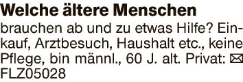 brauchen ab und zu etwas Hilfe? Einkauf, Arztbesuch, Haushalt etc., keine Pflege, bin männl., 60 J. alt.