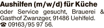 Aushilfen (m/w/d) für Küche oder Service gesucht.