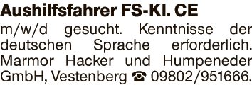 Aushilfsfahrer FS-Kl. CE m/w/d gesucht. Kenntnisse der deutschen Sprache erforderlich.