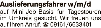Auslieferungsfahrer w/m/d auf Mini-Job-Basis fĂźr Tagestouren im Umkreis gesucht. Wir freuen uns auf Ihren Anruf.