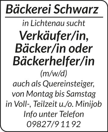 Bäckerei Schwarz in Lichtenau sucht Bäcker/in oder Bäckerhelfer/in (m/w/d) auch als Quereinsteiger, von Montag bis Samstag in Voll-, Teilzeit u./o. Minijob.