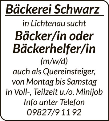 Bäckerei Schwarz in Lichtenau sucht Bäcker/in oder Bäckerhelfer/in (m/w/d) auch als Quereinsteiger, von Montag bis Samstag in Voll-, Teilzeit u./o. Minijob.
