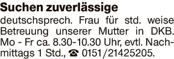 Suchen zuverlässige deutschsprech. Frau fßr std. weise Betreuung unserer Mutter in DKB. Mo - Fr ca. 8.30-10.30 Uhr, evtl. Nachmittags 1 Std.