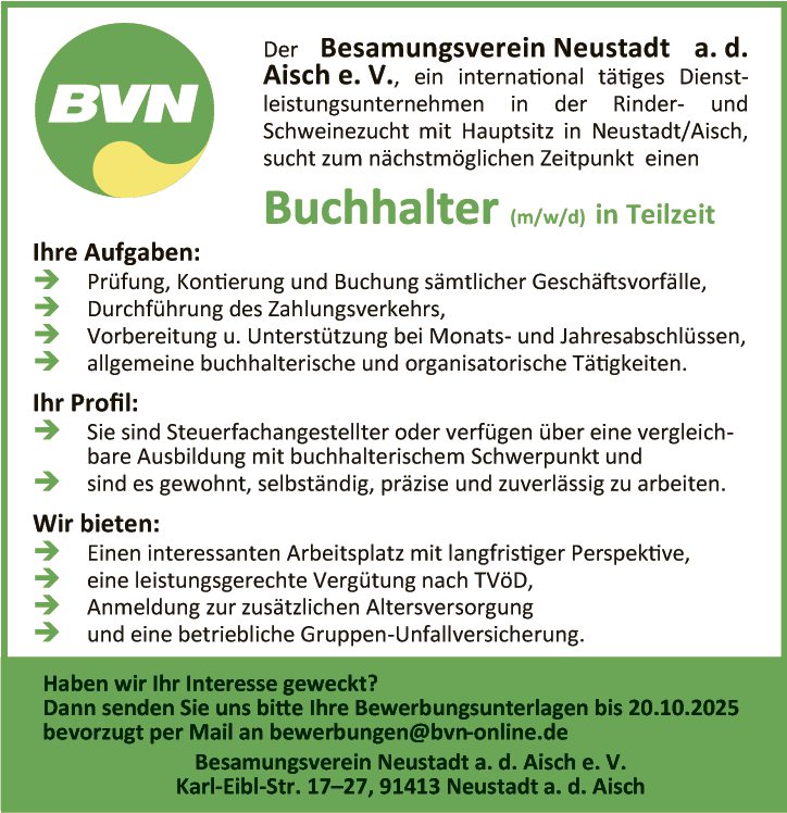 Der Besamungsverein Neustadt a. d. Aisch e. V., ein international tätiges Dienstleistungsunternehmen in der Rinder- und Schweinezucht mit Hauptsitz in Neustadt/Aisch, sucht zum nächstmöglichen Zeitpunkt einen Buchhalter (m/w/d) in Teilzeit.