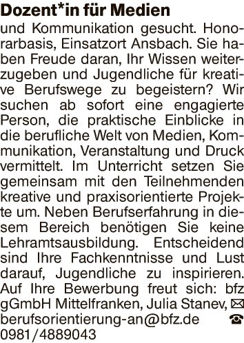 Wir suchen ab sofort eine engagierte Person, die praktische Einblicke in die berufliche Welt von Medien, Kommunikation, Veranstaltung und Druck vermittelt. Im Unterricht setzen Sie gemeinsam mit den Teilnehmenden kreative und praxisorientierte Projekte um. Neben Berufserfahrung in diesem Bereich benötigen Sie keine Lehramtsausbildung. Entscheidend sind Ihre Fachkenntnisse und Lust darauf, Jugendliche zu inspirieren.