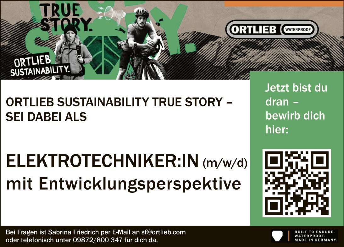 ORTLIEB SUSTAINABILITY TRUE STORY – SEI DABEI ALS ELEKTROTECHNIKER:IN (m/w/d) mit Entwicklungsperspektive.