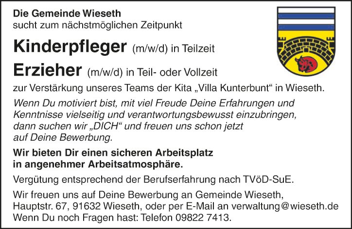 Die Gemeinde Wieseth sucht zum nĂ€chstmöglichen Zeitpunkt Erzieher (m/w/d) in Teil- oder Vollzeit zur VerstĂ€rkung unseres Teams der Kita âVilla Kunterbuntâ in Wieseth.