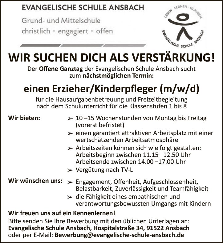 Der Offene Ganztag der Evangelischen Schule Ansbach sucht zum nächstmöglichen Termin einen Erzieher/Kinderpfleger (m/w/d) für die Hausaufgabenbetreuung und Freizeitbegleitung nach dem Schulunterricht für die Klassenstufen 1 bis 8.