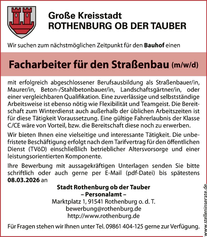 mit erfolgreich abgeschlossener Berufsausbildung als Straßenbauer/in, Maurer/in, Beton-/Stahlbetonbauer/in, Landschaftsgärtner/in, oder einer vergleichbaren Qualifikation. Eine zuverlässige und selbstständige Arbeitsweise ist ebenso nötig wie Flexibilität und Teamgeist. Die Bereitschaft zum Winterdienst auch außerhalb der üblichen Arbeitszeiten ist für diese Tätigkeit Voraussetzung. Eine gültige Fahrerlaubnis der Klasse C/CE wäre von Vorteil, bzw. die Bereitschaft diese noch zu erwerben.
