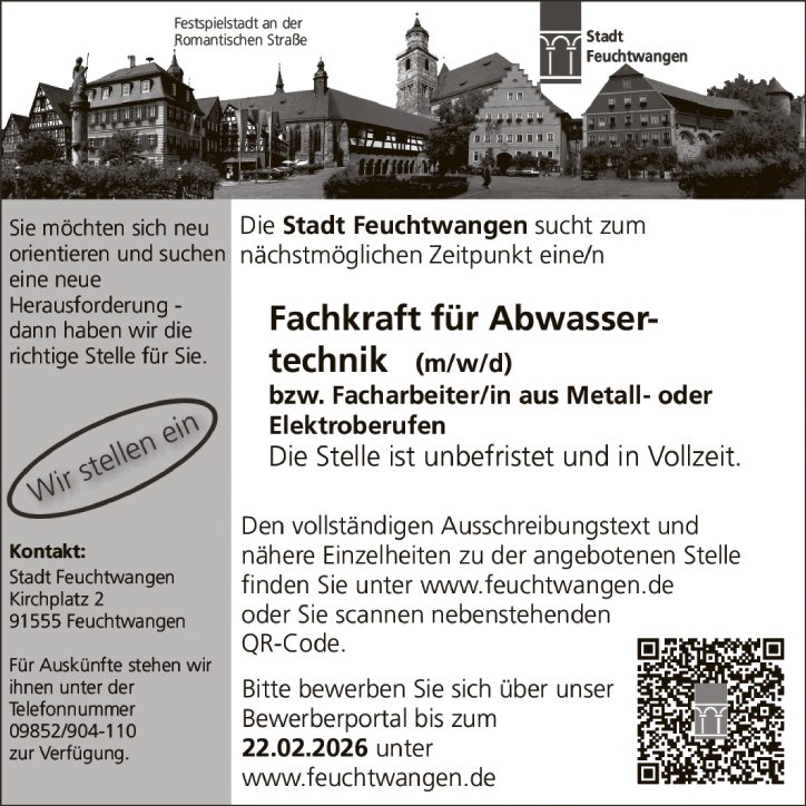 Bitte bewerben Sie sich über unser Bewerberportal bis zum 22.02.2026 unter www.feuchtwangen.de