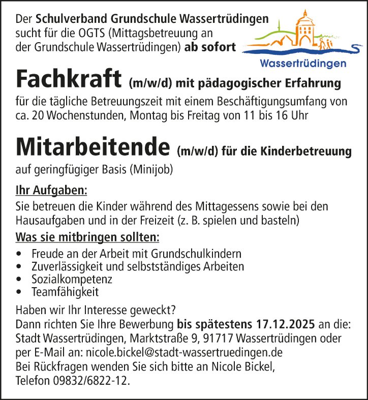 Der Schulverband Grundschule Wassertrüdingen sucht für die OGTS (Mittagsbetreuung an der Grundschule Wassertrüdingen) ab sofort Fachkraft (m/w/d) mit pädagogischer Erfahrung.