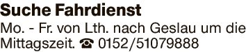 Suche Fahrdienst Mo. - Fr. von Lth. nach Geslau um die Mittagszeit.