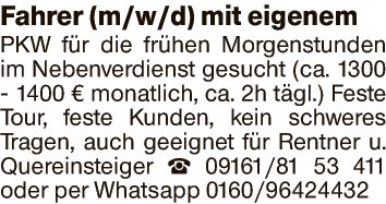 mit eigenem PKW für die frühen Morgenstunden im Nebenverdienst gesucht (ca. 1300 - 1400 € monatlich, ca. 2h tägl.) Feste Tour, feste Kunden, kein schweres Tragen, auch geeignet für Rentner u. Quereinsteiger.