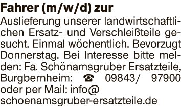 Fahrer (m/w/d) zur Auslieferung unserer landwirtschaftlichen Ersatz- und Verschleißteile gesucht. Einmal wöchentlich. Bevorzugt Donnerstag.