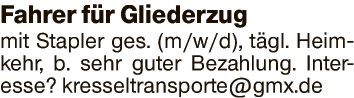 Fahrer für Gliederzug mit Stapler ges. (m/w/d), tägl. Heimkehr, b. sehr guter Bezahlung.