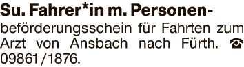 Su. Fahrer*in m. Personenbeförderungsschein fĂŒr Fahrten zum Arzt von Ansbach nach FĂŒrth.