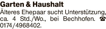 Älteres Ehepaar sucht Unterstützung, ca. 4 Std./Wo., bei Bechhofen.