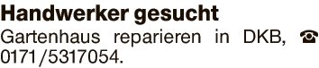 Gartenhaus reparieren in DKB, Tel.: 0171/5317054.