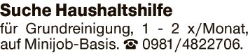 Suche Haushaltshilfe fĂźr Grundreinigung, 1 - 2 x/Monat, auf Minijob-Basis.