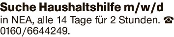 Suche Haushaltshilfe m/w/d in NEA, alle 14 Tage fĂźr 2 Stunden.