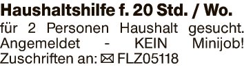 Haushaltshilfe f. 20 Std. / Wo. fĂźr 2 Personen Haushalt gesucht.