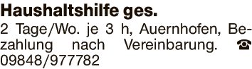 Haushaltshilfe ges. 2 Tage/Wo. je 3 h, Auernhofen, Bezahlung nach Vereinbarung.