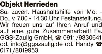 Su. zuverl. Haushaltshilfe von Mo. Do., v. 7.00 - 14.30 Uhr, Festanstellung.