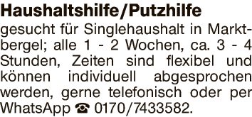 gesucht für Singlehaushalt in Marktbergel; 1 - 2 x pro Woche, ca. 3 - 4 Stunden, Zeiten sind flexibel und können individuell abgesprochen werden, gerne telefonisch oder per WhatsApp Tel.: 0170/7433582.