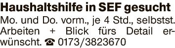 in SEF gesucht Mo. und Do. vorm., je 4 Std., selbstst. Arbeiten + Blick fürs Detail erwünscht.