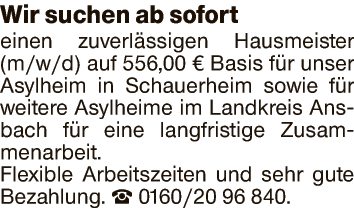 Wir suchen ab sofort einen zuverlässigen Hausmeister (m/w/d) auf 556,00 € Basis für unser Asylheim in Schauerheim sowie für weitere Asylheime im Landkreis Ansbach für eine langfristige Zusammenarbeit.