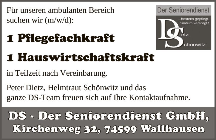 FĂźr unseren ambulanten Bereich suchen wir (m/w/d): Hauswirtschaftskraft in Teilzeit nach Vereinbarung.