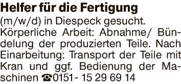 Helfer für die Fertigung (m/w/d) in Diespeck gesucht.