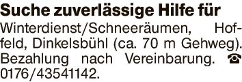 Suche zuverlässige Hilfe für Winterdienst/Schneeräumen, Hoffeld, Dinkelsbühl (ca. 70 m Gehweg).