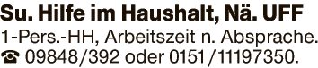 Su. Hilfe im Haushalt, Nä. UFF 1-Pers.-HH, Arbeitszeit n. Absprache.