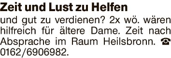und gut zu verdienen? 2x wö. wären hilfreich für ältere Dame. Zeit nach Absprache im Raum Heilsbronn.