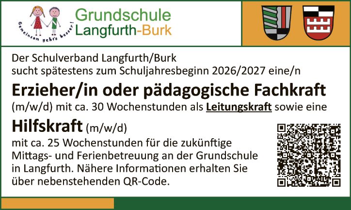 Der Schulverband Langfurth/Burk sucht spätestens zum Schuljahresbeginn 2026/2027 eine Hilfskraft (m/w/d) mit ca. 25 Wochenstunden fßr die zukßnftige Mittags- und Ferienbetreuung an der Grundschule in Langfurth.