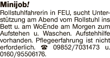 Rollstuhlfahrerin in FEU, sucht Unterstützung am Abend vom Rollstuhl ins Bett u. am WoEnde am Morgen zum Aufstehen u. Waschen. Aufstehhilfe vorhanden. Pflegeerfahrung ist nicht erforderlich.